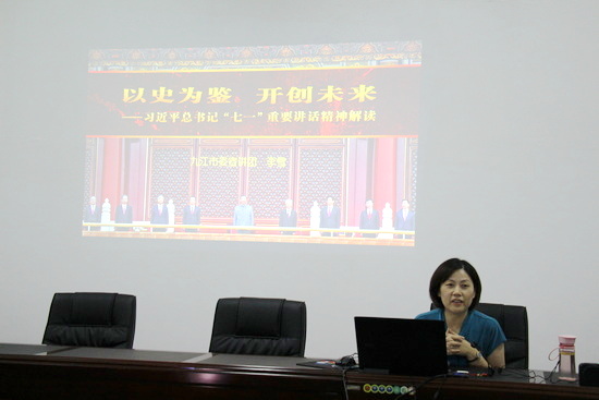 9月22日下午,材料科学与工程学院在材料实验楼306会议室举行习近平总书记“七一”重要讲话精神专题宣讲会。邀请了马克思主义学院党委副书记李雪教授作题为《以史为鉴 开创未来——习近平总书记“七一”重要讲话精神解读》专题宣讲会。学院党委副书记陈娜主持报告会。学院领导、全体教师聆听了宣讲会。