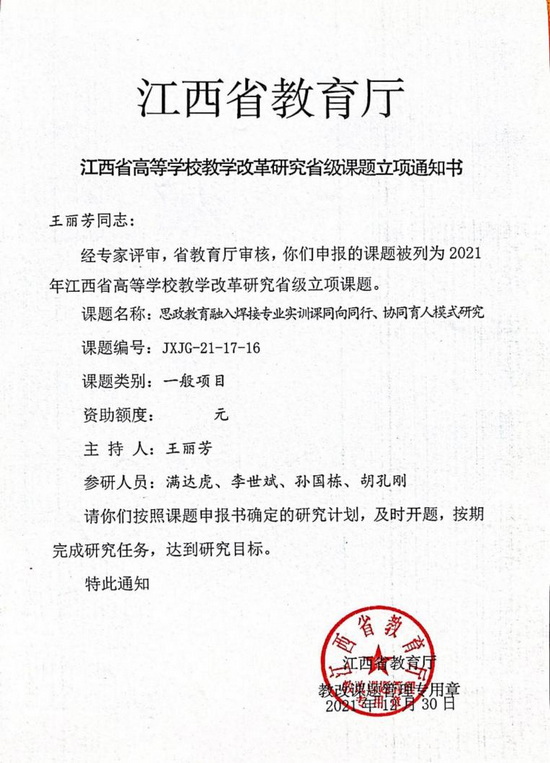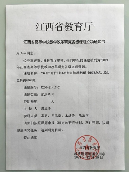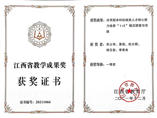 学院积极申报国家级、省级一流课程和教学改革等项目。2021年《机械制图》已通过江西省一流本科课程认定,《材料科学基础ⅱ》等3门课程荣获校级一流本科课程建设立项,材料成型专业教学团队获批江西省高水平本科教学团队建设立项,教学改革研究项目成绩斐然,荣获江西省教学改革重点课题1项,一般课题1项,由我院教师杜大明、李养良参与的《应用型本科机械类人才核心能力培养“1 3”模式探索与实践》荣获江西省教学成果一等奖。
