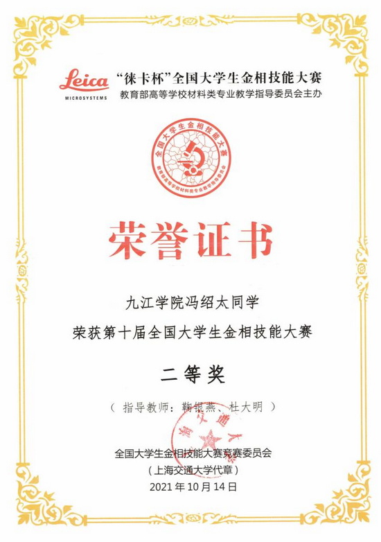 学院积极鼓励学生参加各类学科竞赛,荣获2021年中国大学生工程实践与创新能力大赛银奖1项;第六届江西省大学生工程训练综合能力竞赛金奖1项、银奖2项、铜奖1项;中国大学生材料热处理创新创业赛三等奖1项;第五届全国大学生焊接创新大赛一等奖1项、二等奖2项、三等奖1项;2021年江西省先进成图大赛二等奖1项;获得第十届全国大学生金相技能大赛二等奖1项、3等奖1项;第五届江西省大学生金相技能大赛一等奖1项、3等奖5项。