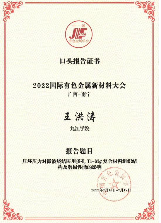 我院工程中心副主任王洪涛教授应邀做了题为《压制压力对微波烧结医用多孔ti-mg复合材料组织及性能的影响》的分会报告,展示了微波烧结制备新型多孔ti-mg复合材料领域的最新成果,报告引起了与会学者的兴趣和关注。我院曹明等老师提交的论文“effect of vaccum heat treatment on tribological properties of cu- and al-doped cus/mos2composites coatings”获评优秀论文,独立培养的李杰和郑旭东2名硕士生也通过参加此次学术交流活动,增强了科研创新和沟通交流能力,开拓了学术研究视野。