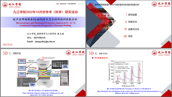 张义福博士做了《超声波焊接制备ti/al/ti层状复合材料》的学术报告。介绍了层状复合材料的工程运用背景、常用技术与制备难点,从界面温度、显微组织和力学性能分析了ti/al/ti界面形成和约束强化效应机制,并对后期将开展的工作与在座老师进行了探讨。