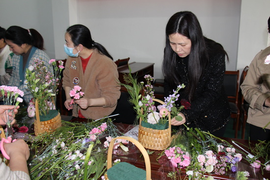 活动特邀资深插花老师来到现场讲解插花的种类和原则,插花中要注意色彩、主次、质感、平衡以及花的护理等知识。在插花师的指导下,大家跃跃欲试,以高涨的热情投入到插花创作之中。在一片芬芳的花儿世界中女教师们剪枝、绑枝、粘贴,忙得不亦乐乎……大家完全沉浸在自我创作和欣赏中。一枝花、一棵草在教师们的巧手下,经过修剪、整枝、弯曲及构思、造型、设色加工,变得格调高雅、清新怡人。参加活动的教师们一个个都成了“花仙子”。