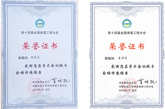 我院工程中心主任纪岗昌教授、副主任王洪涛教授分别做了《超音速火焰喷涂强韧耐磨wc基金属陶瓷涂层》、《az91d镁合金表面纳米化及低温扩渗mg-al合金层的组织结构研究》的热喷涂技术论坛特邀报告,姚海龙副教授做了《原位微锻冷喷涂锌涂层组织结构与抗腐蚀性能及后热处理影响研究》的表面工程青年论坛口头报告,介绍了我院在高强韧wc基金属陶瓷、镁合金表面热扩散防腐及冷喷涂锌涂层抗腐蚀领域的最新进展,报告引起了与会学者的兴趣和关注。同时,王洪涛教授作为分会场主持人参加了部分报告的主持工作。