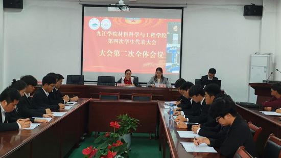 下午13点30分,预备会议报告了学代会筹备情况,通过了代表资格审查报告,大会议程,大会主席团、秘书长、副秘书长名单等。下午14点00分,九江学院材料科学与工程学院第四次学生代表大会在雄壮的国歌声中开幕。
