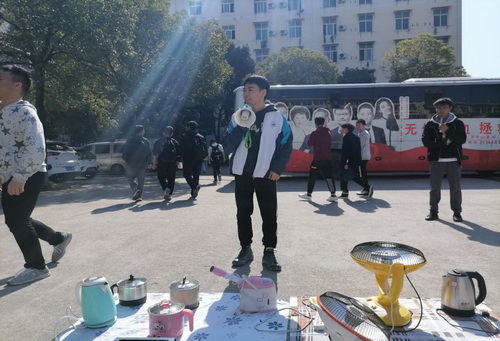 为了让同学们了解并熟悉平时自己所使用的违禁用品电器,普及同学们的用电常识,提高安全防范意识,11月11日中午12时,机械学院、材料学院与经济学院、建工学院、文传学院、化环学院联合在三食堂前广场举办“宿舍安全教育”活动。