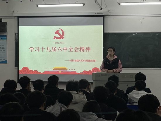11月21日晚6点,材料科学与工程学院组织全院学生开展“学习十九届六中全会精神”主题教育团课。本次团课由各班班长和团支书主持,各班全体学生参加。材料学院党委副书记陈娜老师出席了a2061班团课。