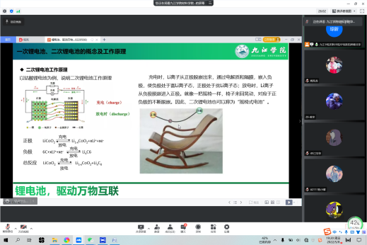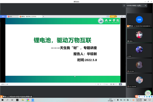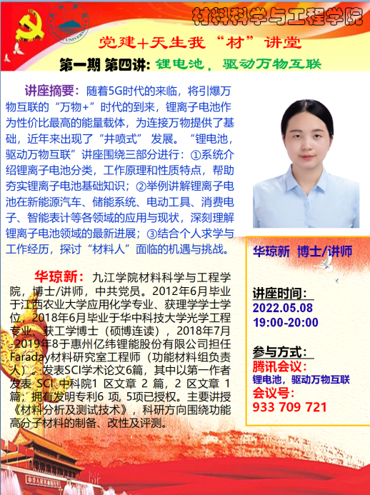 2022年5月8日,材料科学与工程学院成功举办了“党建 天生我‘材’讲堂”的线上讲座活动,第一期第四讲由材料科学与工程学院华琼新博士主讲,以“锂电池,驱动万物互联”为题,围绕三部分进行:①系统介绍锂离子电池分类,工作原理和性质特点,帮助夯实锂离子电池基础知识;②举例讲解锂离子电池在新能源汽车、储能系统、电动工具、消费电子、智能表计等各领域的应用与现状,深刻理解锂离子电池领域的最新进展;③结合个人求学与工作经历,探讨“材料人”面临的机遇与挑战。华琼新博士的精彩讲座引起了学生的广泛兴趣、线上交流不断。