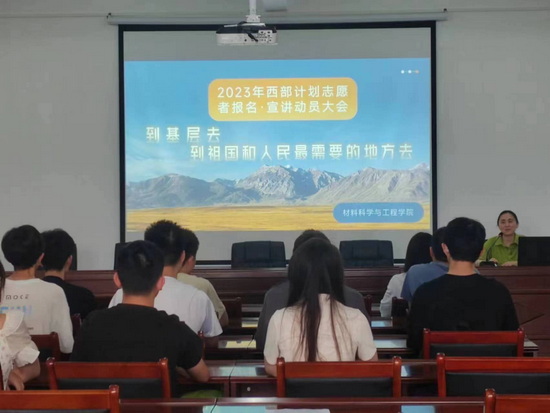 材料科学与工程学院积极响应号召2023届毕业生,用一到三年的时间,完成一件终生难忘的事,践行“请党放心、强国有我”的青春誓言,做扎根西部的践行者、志愿精神的传承者、时代号召的响应者,为西部乡村振兴、共同富裕、提质发展贡献青春力量。2023年5月17日,材料学院在材料楼306会议室召开主题为“到基层去,到祖国和人民最需要的地方去”的2023年西部计划志愿者报名、宣讲动员大会。