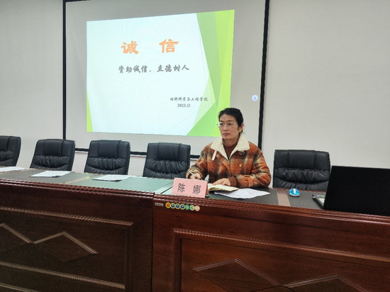 为不断塑造大学生的诚信与感恩品质,进一步推进大学生思想政治教育工作, 促进各项资助政策的充分宣传和有效落实,2023年11月29日,材料科学与工程学院按照学校关于“资助诚信教育”主题活动的文件精神,结合大学生核心素质培养与实际工作,围绕资助管理制度与政策普及等主题,组织了一场资助育人主题讲座,主讲人为学院党委副书记陈娜。