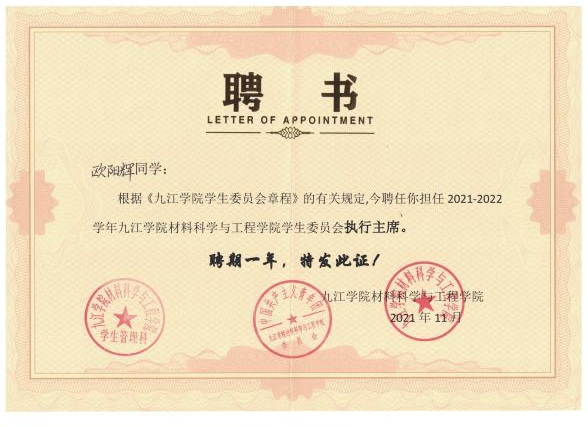 从担任班级班长到学院学生会执行主席,欧阳辉同学时刻以优秀学生干部规范自己。在班级,他充分发挥老师和同学之间的纽带作用,团结同学,多次带领班级在学院各项活动中取得优异成绩,并荣获九江学院“文明班级”和“五四红旗团支部”等称号。在院学生会任职期间,他虚心向学长请教,多次带头参加和策划学院的多项活动,并取得圆满成功,组织策划院迎新工作,主持学院学生代表大会,工作得到了老师和同学们的一致好评。