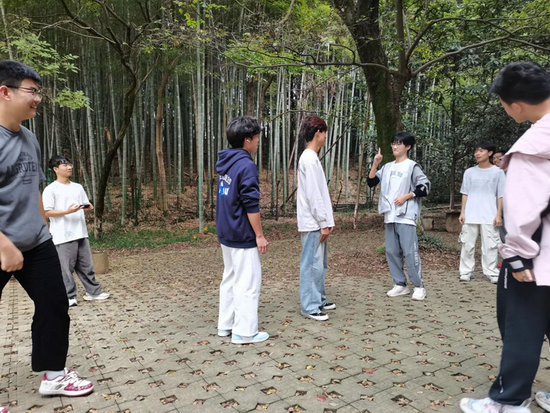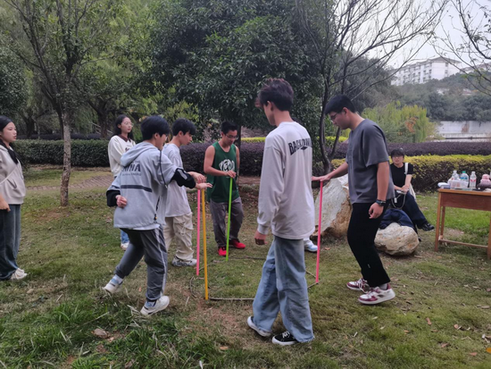 活动a区位于五柳湖与陶渊明像周边,设有“不倒森林”与“你划我猜”项目。材料学院同学迅速组队,在“不倒森林”项目中围成圆圈,左手背后,仅用右手操控竖杆,在1分钟内努力完成10次移动且保持杆不倒;“你划我猜”环节,三名队员配合默契,比划者生动描述,猜词者专注思考,力争在3分钟内答对两题得分。