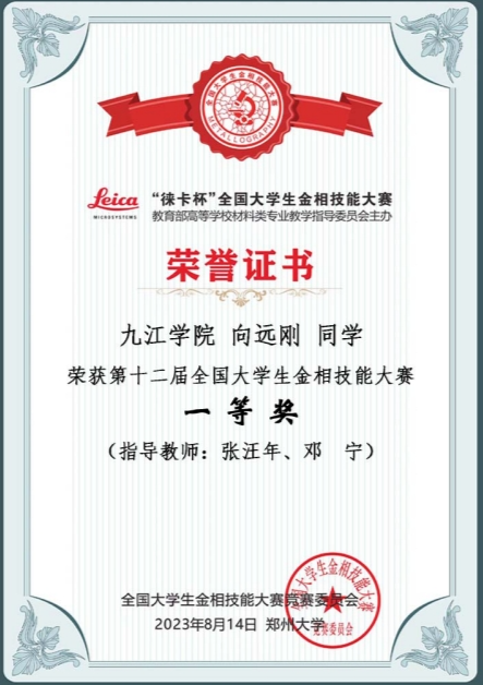 向远刚,贵州黎平人,中共党员,2020年9月就读于九江学院材料科学与工程学院a2021班。现担任a2021班团支部副书记、班长;材料学院学生党支部纪检委员。曾任九江学院第六届学生委员会委员、材料学院第六届学生会执行主席、曾获两次国家励志奖学金2次、获得校级二等奖学金1次、三等奖学金2次。获得“三好学生”、“优秀学生干部”、“优秀团干部”、“优秀助理辅导员”、九江市及九江学院暑期三下乡“先进个人”等荣誉,在2023年8月获得“徕卡杯”第十二届全国金相技能大赛荣获全国一等奖。